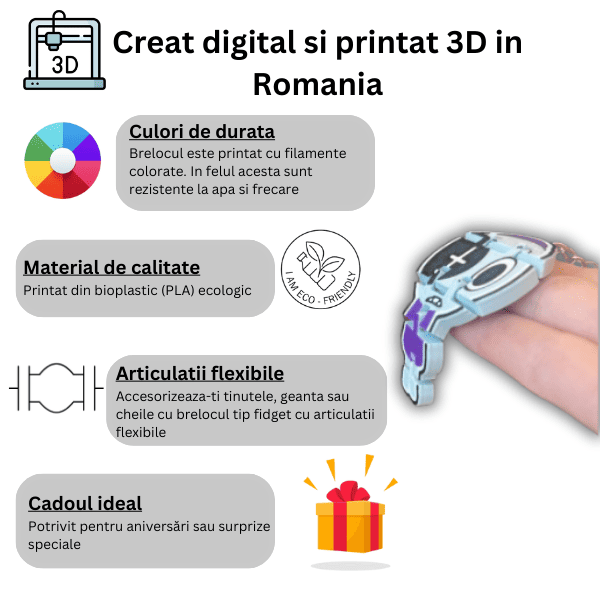 - 2 in 1: Poate fi folosit atat ca breloc cat si pe post de fidget datorita articulatiilor mobile.