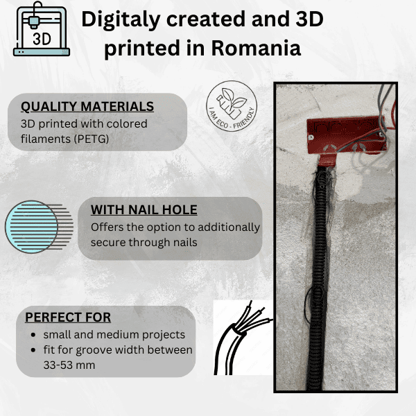 Organizeaza si securizeaza cablurile electrice in perete cu clamele de fixare printate 3D din materiale biodegradabile (PETG). Pachetul contine un set de 25 de bucati ideal pentru proiecte mici sau medii.