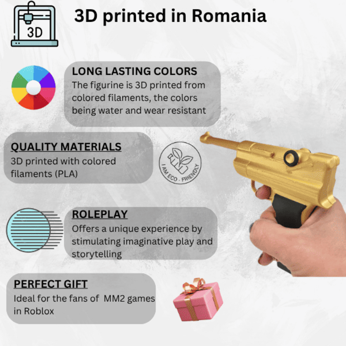 Descopera recuzita din jocul Murder Mystery 2, Roblox. Luger este acum disponibil ca recuzita imprimata 3D in culori vibrante. Ideal pentru colectionari si fanii jocului, acest cadou unic este realizat din materiale biodegradabile si rezistente la apa. Cu un design inspirat din joc, aduce un strop de magie in orice colectie!