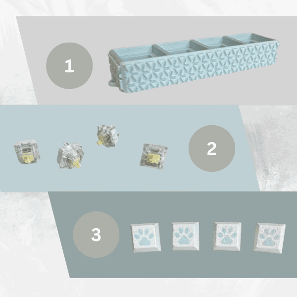 - Set complet: Include 4 taste cu labute de pisica, baza clickerului (personalizabila cu text scurt) si 4 switchuri de tastatura mecanica. Acestea sunt complet asamblate.