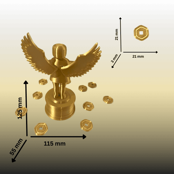 • Dimensiuni aproximative: o moneda Robux -21x21x3 mm, figurina trofeu 125Hx115Lx55A mm
