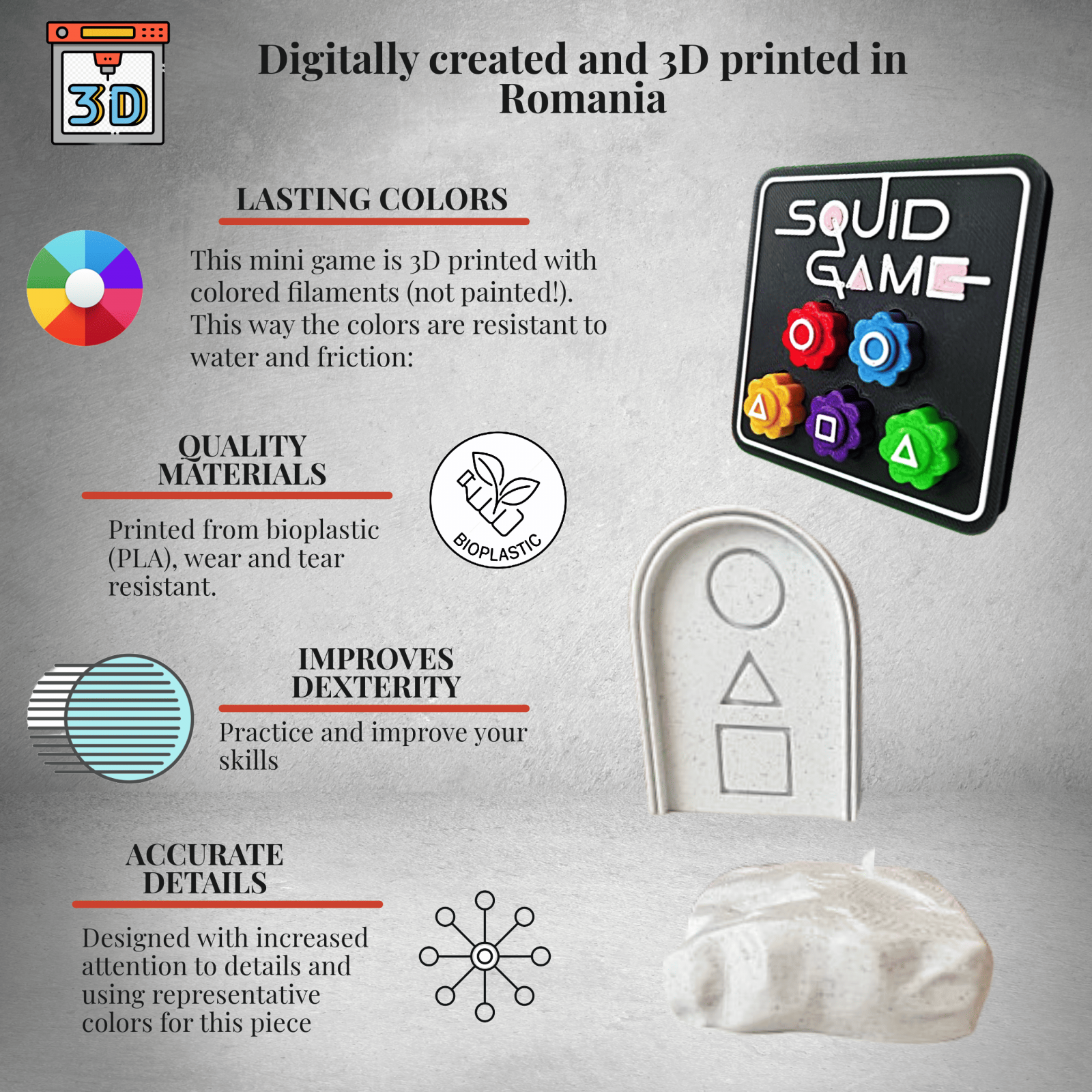Descopera frumusetea jocurilor traditionale coreene cu acest set ce contine 2 jocuri, perfect pentru distractie in familie sau cu prietenii! Acest set imprimat 3D imbina distractia atemporala cu un design indraznet, unic, extras din serialul TV de succes, Squid Games. Piesele au culori vibrante si sunt realizate cu materiale de inalta calitate, ecologice, pentru a asigura atat durabilitate, cat si o estetica atragatoare. Perfect pentru nopti de joc, petreceri sau cadouri, acest set este distractiv si functional!