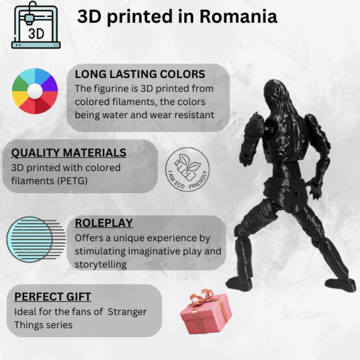 Materiale biodegradabile: Este produs din materiale de calitate (plastic PETG) si biodegradabile. Figurina este imprimata cu ajutorul tehnologiei 3D.