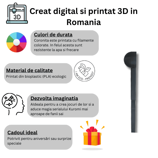 Materiale biodegradabile: Este produsa din materiale de calitate (plastic PLA) si biodegradabile. Coronita este imprimata cu ajutorul tehnologiei 3D din filamente colorate, culorile fiind astfel rezistente la apa si frecare.