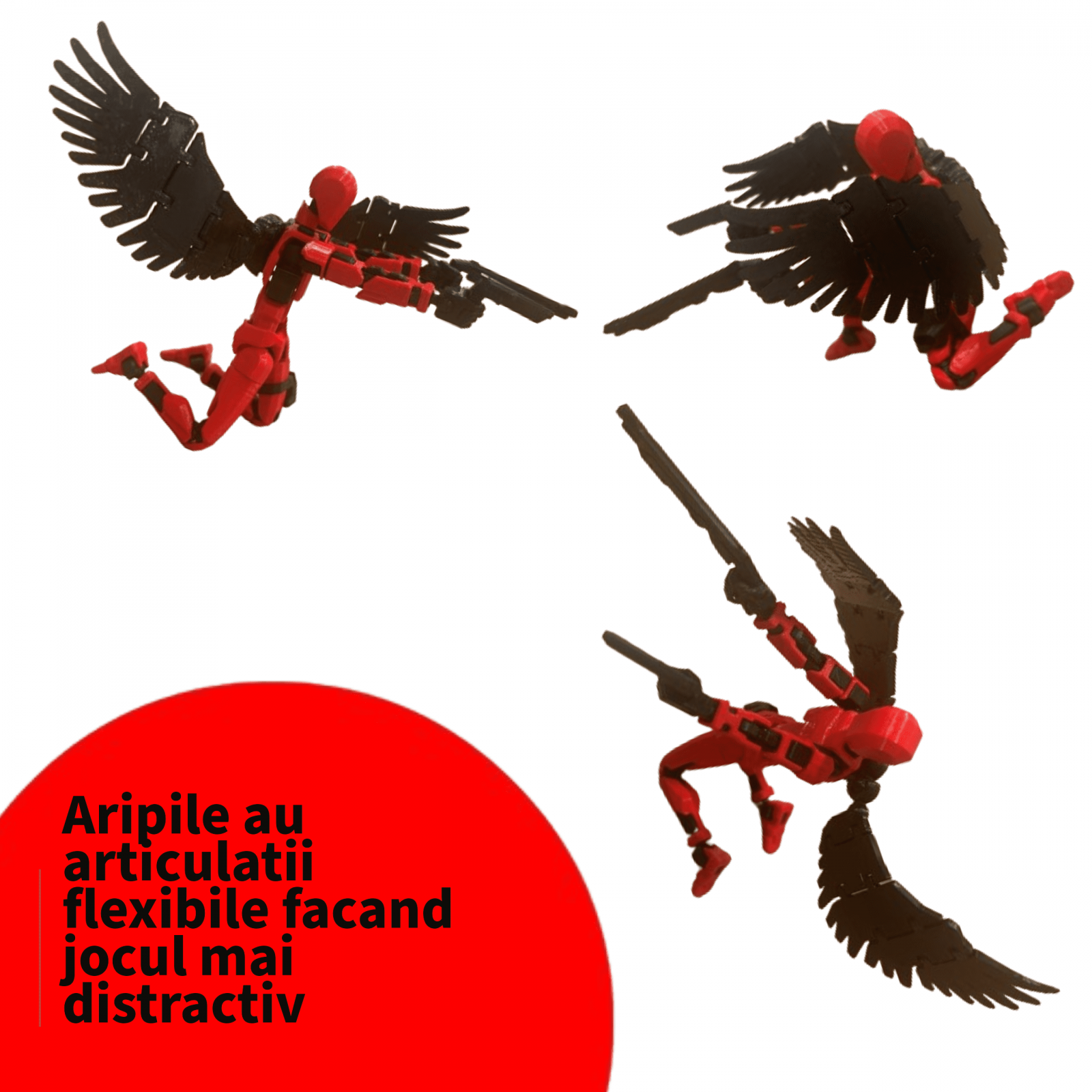 13 Articulatii care se pot roti 360 grade: Corpul este complet demontabil si are 13 articulatii mobile, permitand o gama larga de pozitii. Cu designul sau flexibil, ofera posibilitati nelimitate pentru joc dinamic si afisaje creative. De asemenea aripile sunt articulate si pot fi puse in diferite pozitii de joc.